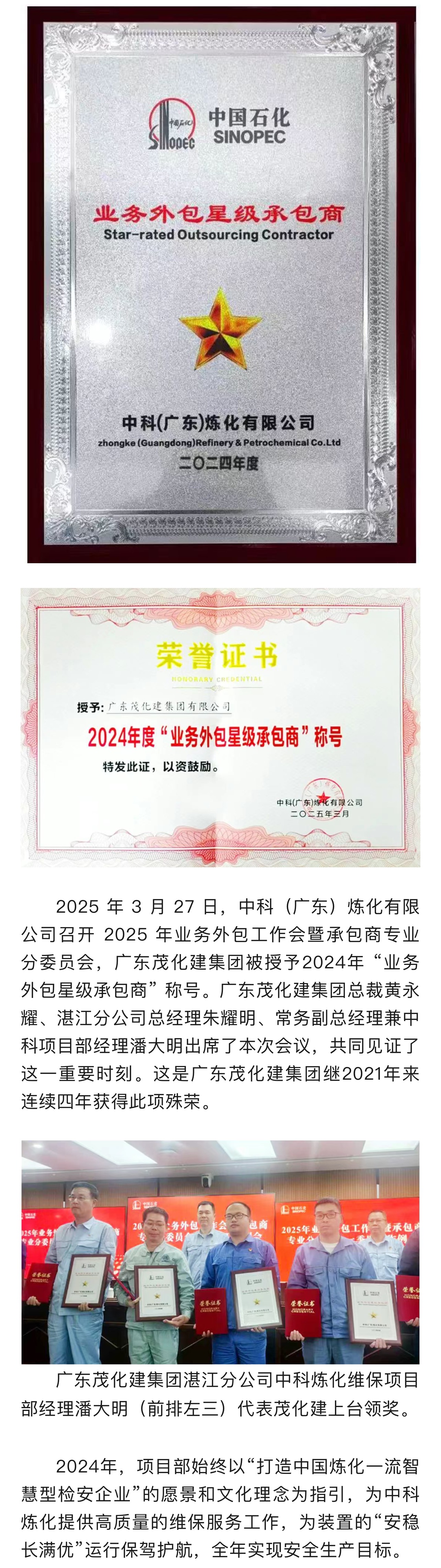 喜報(bào)|榮獲2024年中科煉化 “業(yè)務(wù)外包星級(jí)承包商”稱(chēng)號(hào)