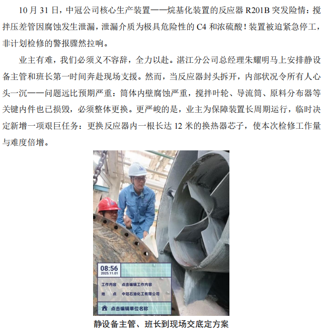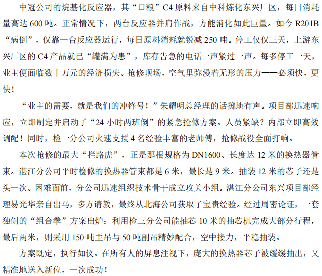 湛江分公司中冠項(xiàng)目部搶修烷基化反應(yīng)器紀(jì)實(shí)